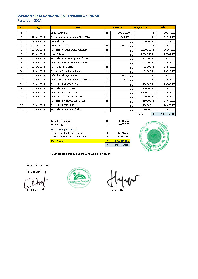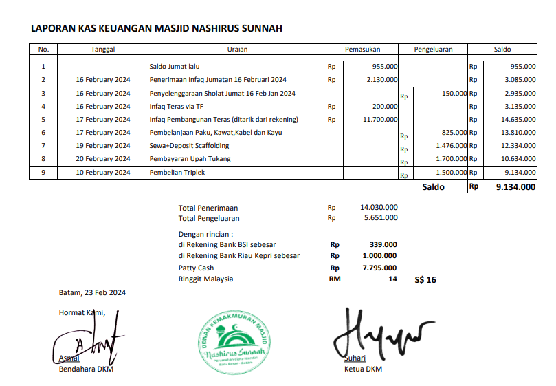 Berikut ini adalah laporan kondisi keuangan Masjid Nashirus Sunnah Per 23 Feb 2024
